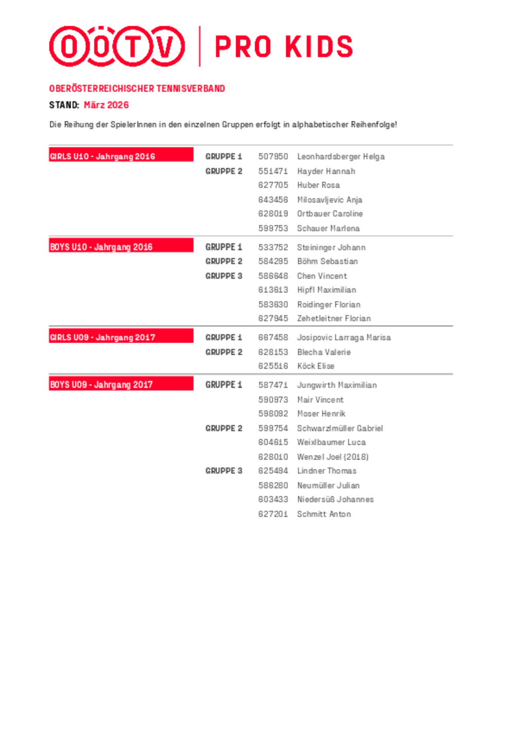 Die Erstellung erfolgt im Mai und Oktober 2026 in enger Rücksprache mit den Landesverbänden bzw. auf Basis der ÖTV-Kids-Einladungsturniere, der ÖTV-Kids-Kat.-I-Serie sowie der ÖTV-Lehrgänge.