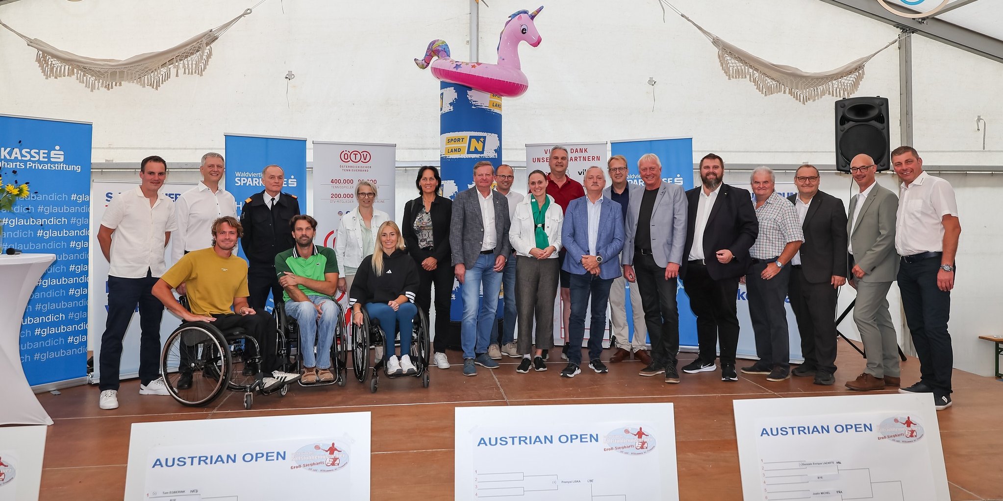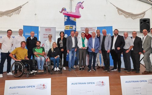 Die Ehrengäste der Eröffnungsfeier, von links nach rechts: Philipp Dörre (Turnierleiter), Nico Langmann (Österreichs Nummer 1 im Rollstuhltennis), Michael Schelm (Obmann von Rollstuhltennis Austria), Kurt Liball (Bezirksfeuerwehrkommandant-Stellvertreter von Waidhofen/Thaya), Roman Zechmeister (Österreichs Nummer 1 bei den Quads, ÖTV-Rollstuhltennisreferent), Mag.a Manuela Herzog (Bezirkshauptfrau Waidhofen/Thaya), Christina Pesendorfer (Österreichs Nummer 1 im Rollstuhltennis), Petra Schwarz (NÖTV-Präsidentin), Gottfried Waldhäusl (2. Präsident des NÖ Landtags), Dr. Andreas Hauer (Obmann des UTC Groß-Siegharts), Viktoria Hutter (Bundesrätin, in Vertretung von Landeshauptfrau Johanna Mikl-Leitner), Ulrich Achleitner (Bürgermeister von Groß-Siegharts), Alois Maurer (Landesdirektor der s Versicherung), Dipl.-Kfm (FH) Peter Hochleitner (Vorsitzender-Stellvertreter des Vorstands der Waldviertler Sparkasse Bank AG), Michael Bierbach (Landtagsabgeordneter, in Vertretung von Vizekanzler Andreas Babler), Michael Litschauer (Vizebürgermeister von Groß-Siegharts), Franz Piffl (Obmann des TC Ludweis Aigen), Harald Moldaschl (Regionaldirektor der Waldviertler Sparkasse Bank AG), Dir. Christian Reegen (Vorsitzender des Vorstandes der Sparkasse der Stadt Groß-Siegharts Privatstiftung), Andreas Peschel (Sportstadtrat von Groß-Siegharts).