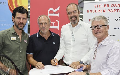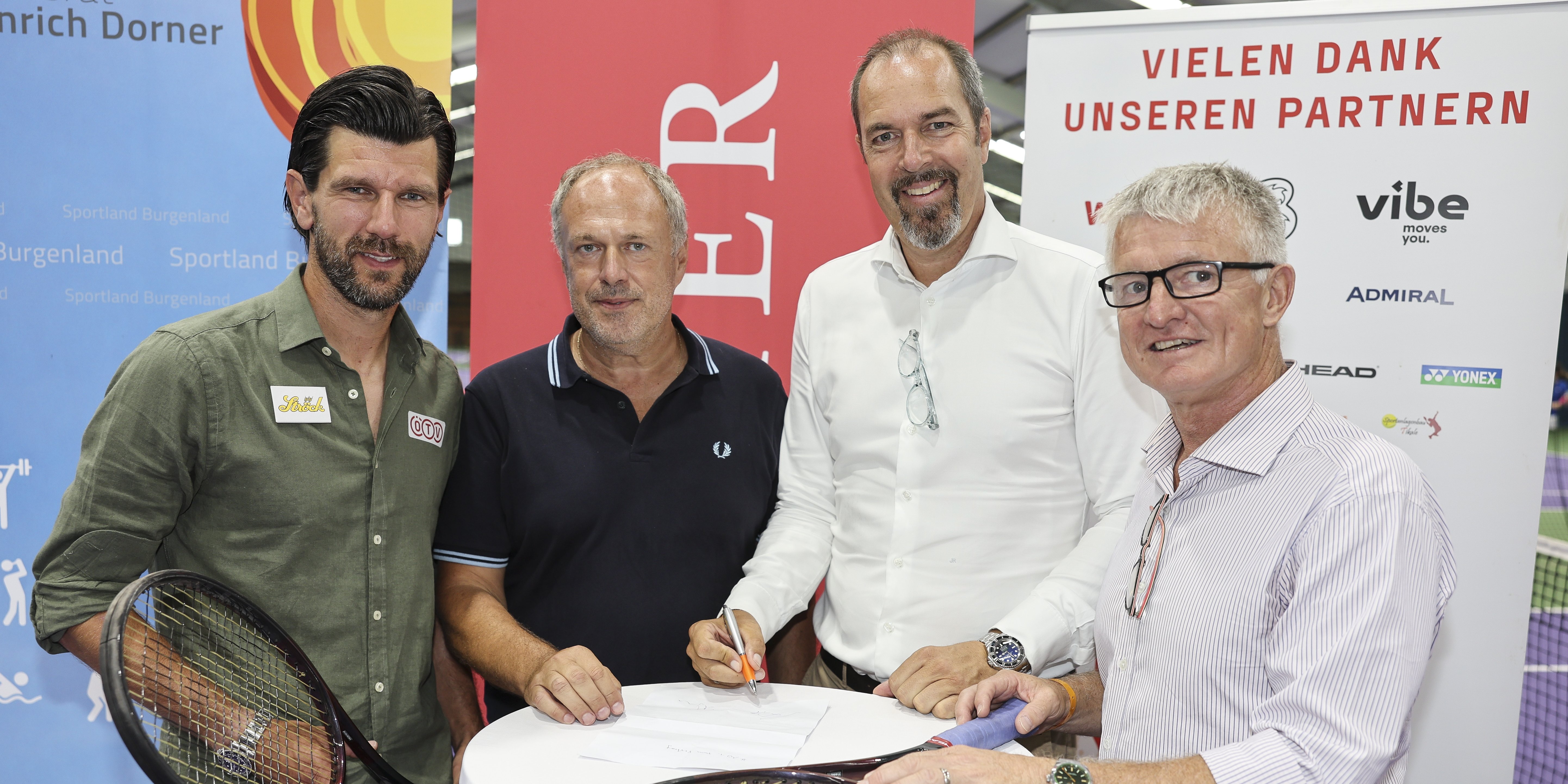 Bei der Präsentation der Kooperation bei der Pressekonferenz der win2day Open – Die Tennis-Staatsmeisterschaften in Oberpullendorf, von links nach rechts: Jürgen Melzer (ÖTV-Sportdirektor und -Davis-Cup-Kapitän), Richard Grasl (KURIER- und Mediaprint-Geschäftsführer), Jürgen Roth (ÖTV-Vizepräsident), Thomas Schweda (ÖTV-Geschäftsführer Wirtschaft).