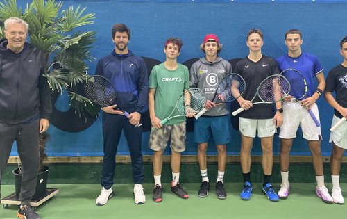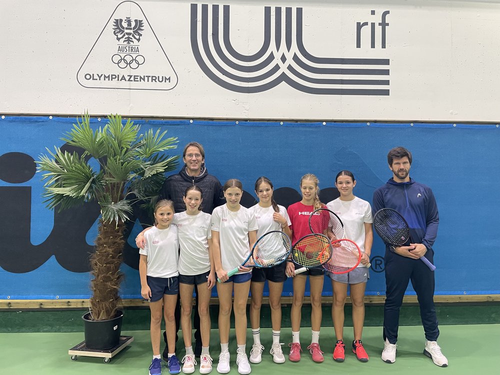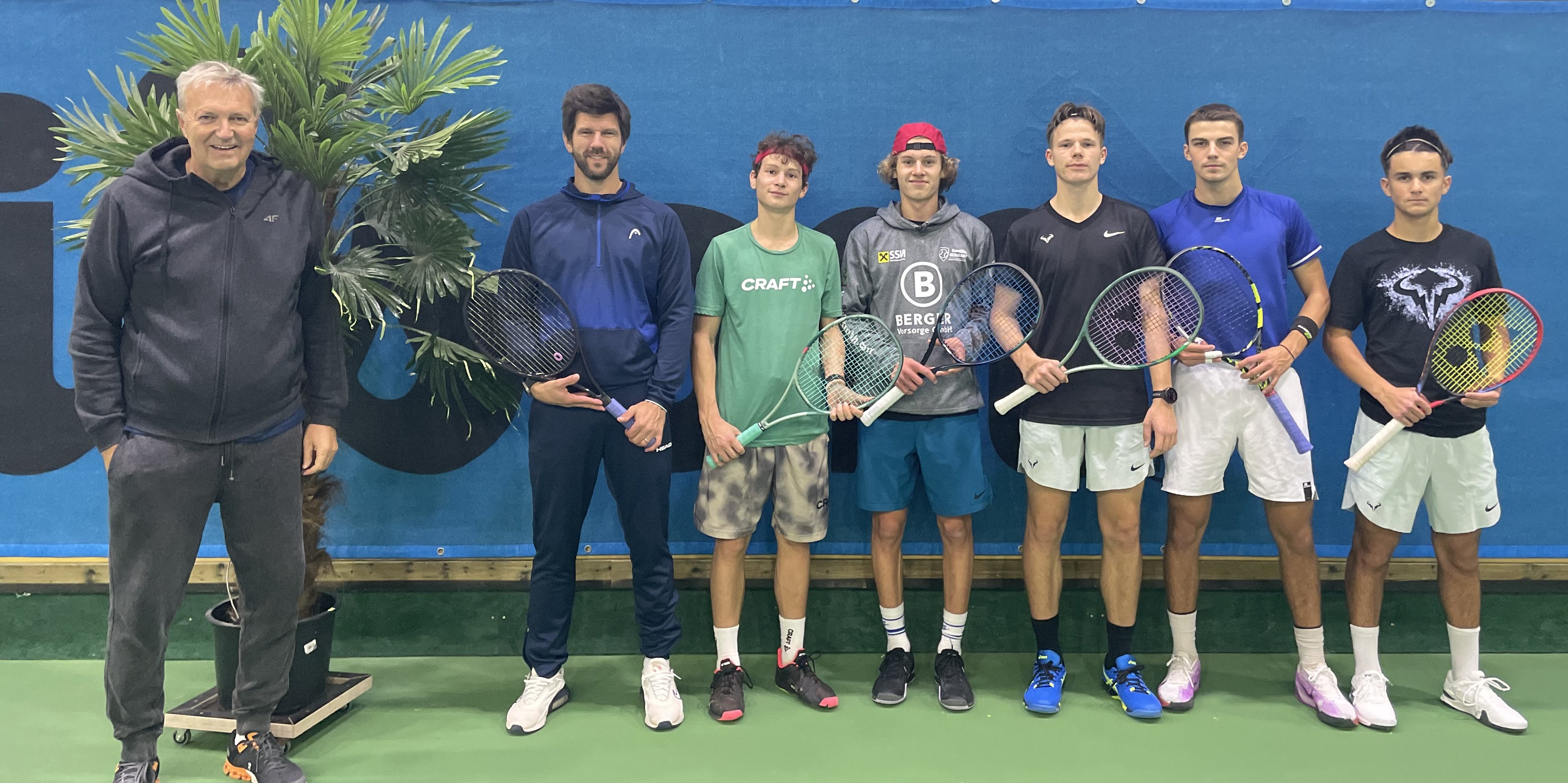 Von links nach rechts: Gerald Mild (Direktor der European Tennis Base und STV-Vizepräsident) und Jürgen Melzer (ÖTV-Sportdirektor und -Davis-Cup-Kapitän) mit einigen der jungen Talente in Salzburg.