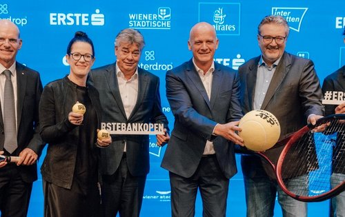 Ralph Müller (CEO Wiener Städtische Versicherung), Gerda Holzinger-Burgstaller (CEO Erste Bank), Vizekanzler und Sportminister Werner Kogler, Turnierdirektor Herwig Straka, Sportstadtrat Peter Hacker und Dominic Thiem.