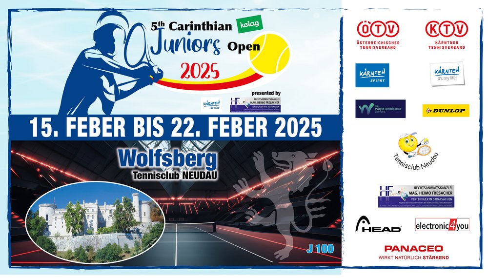 Ein außerordentlicher sportlicher Leckerbissen erwartet die österreichische, insbesondere die Kärntner und Lavanttaler Tennisszene in der Zeit vom 15. bis 23. Februar 2025 in der Tennisarena Auen. Zum fünften Mal bringt die „Carinthian-Juniors-Trophy“ im Rahmen der ITF-Junioren-World-Tour ein internationales Feld an Junioren-Spitzentennisathletinnen und -Athleten nach Wolfsberg. Verantwortlich für dieses Event der Kategorie J100 zeichnet das bewährte Veranstalterteam mit Turnierdirektor Gernot Dreier, KTV-Schiedsrichter und Turnierreferent, KTV-Vizepräsidentin und Referentin für Frauen, Inklusion und Schultennis Julia Adlbrecht und Organisationsleiter Edwin Themel, Obmann des TC St. Andrä.