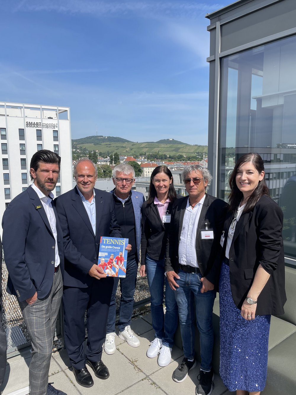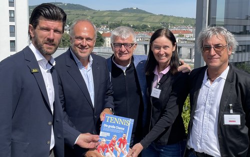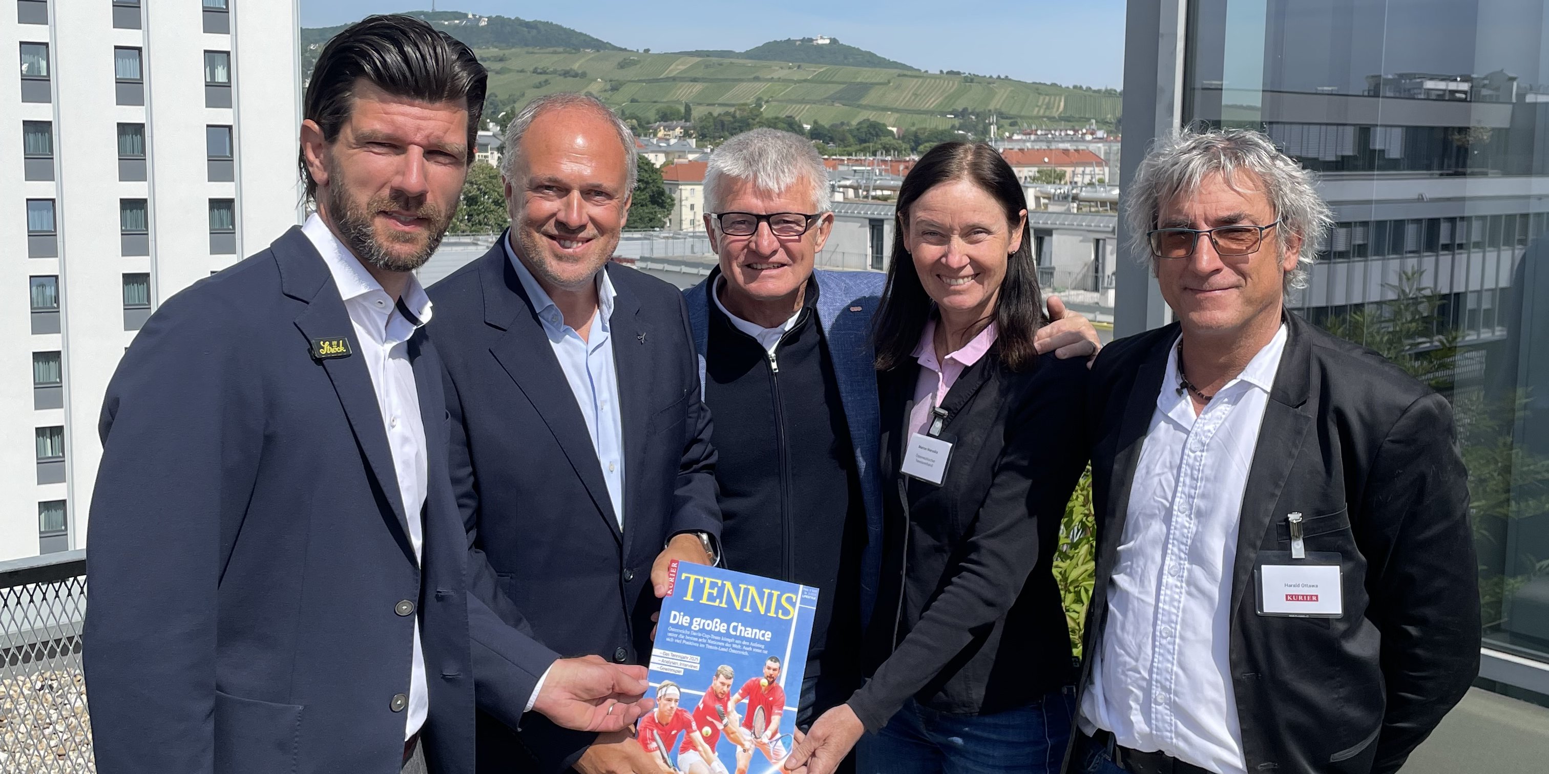 Beim KURIER-Werbe-Amor wurde zugleich das KURIER-Tennismagazin 2025 offiziell präsentiert. Von links nach rechts: ÖTV-Sportdirektor und -Davis-Cup-Kapitän Jürgen Melzer, KURIER- und Mediaprint-Geschäftsführer Richard Grasl, ÖTV-Geschäftsführer Wirtschaft Thomas Schweda, ÖTV-Sportkoordinatorin und -Billie-Jean-King-Cup-Kapitänin Marion Maruska, KURIER-Tennisexperte Harald Ottawa.