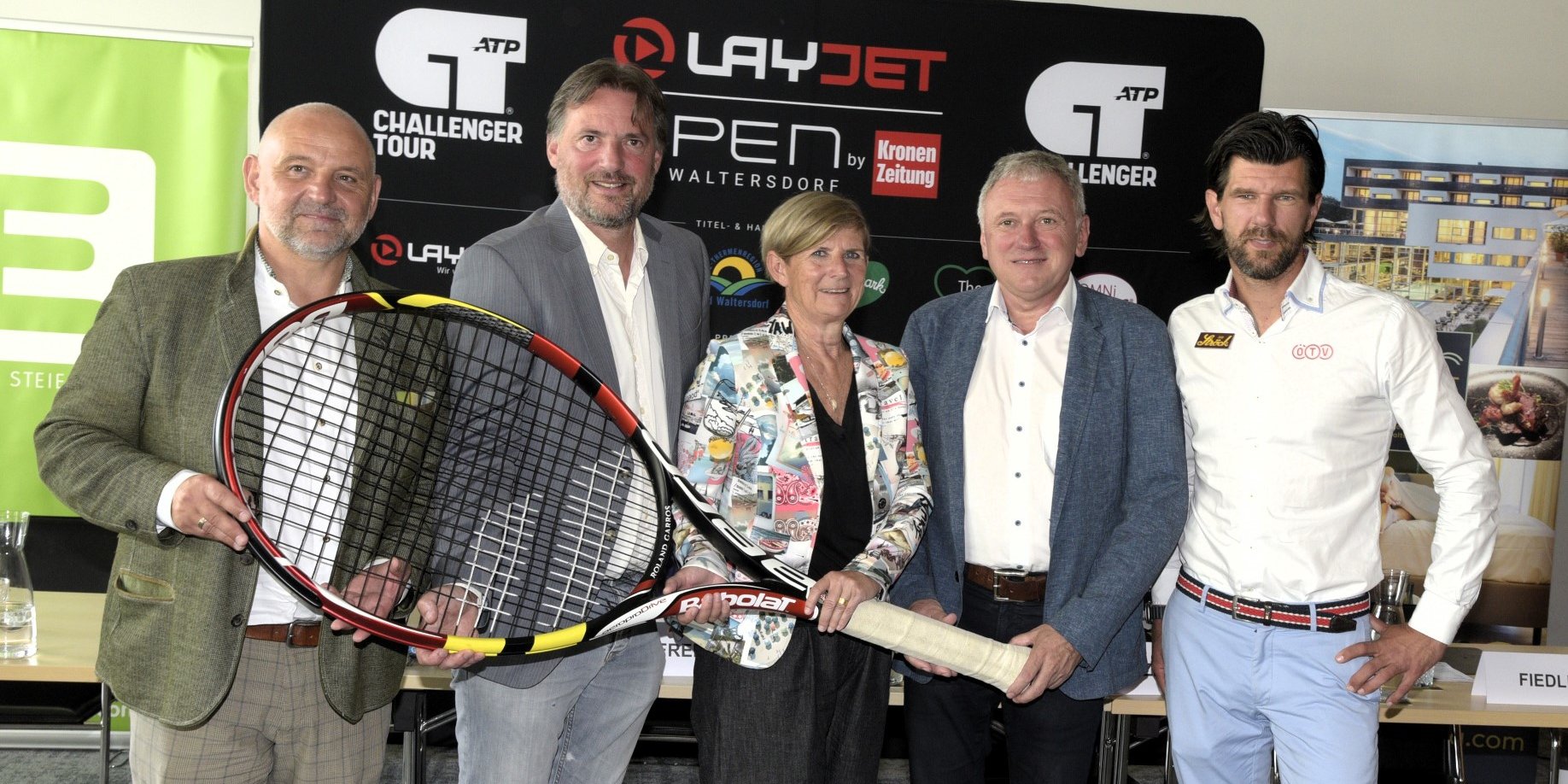 Von links nach rechts: Thomas Gneist (General Manager Spa Resort Styria), Sascha Freitag (Turnierdirektor und Veranstalter LAYJET-OPEN), Barbara Muhr (Präsidentin des Steirischen Tennisverbands), Johann Fiedler (Bürgermeister Bad Waltersdorf), Jürgen Melzer (ÖTV-Sportdirektor und -Davis-Cup-Kapitän).