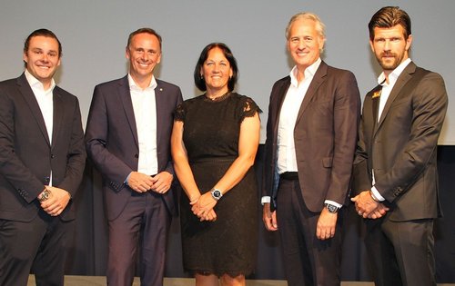 Turnierdirektor Florian Leitgeb, Sportlandesrat Jochen Danninger, NÖTV-Präsidentin Petra Schwarz-Ritter, ÖTV-Präsident Martin Ohneberg, ÖTV-Sportdirektor und Davis-Cup-Kapitän Jürgen Melzer bei der 70-Jahre-Feier des NÖTV und der Auslosung.