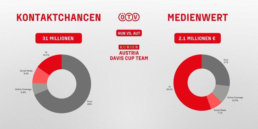 Das KURIER Austria Davis Cup Team ist in aller Munde: Mit dem sensationellen Sprung zu den Davis Cup Final 8 der acht besten Nationen der Welt in Bologna (18.–23. November) hat sich Österreichs Herrennationalmannschaft ins Rampenlicht gespielt. Dies bestätigt auch eine Medienwertanalyse, die der Österreichische Tennisverband nach dem 3:2-Sieg gegen Ungarn in Debrecen vom 12./13. September bei der United Synergies Medien- und Informationsagentur GmbH in Auftrag gegeben hat. Ein Auszug der imposanten Zahlen: Die Berichterstattung über den Länderkampf in Österreichs Nachbarland brachte stolze 31 Millionen Kontaktchancen, zu 69 Prozent über Berichterstattung in den Printmedien, zu 15,2 Prozent im TV, zu 9,4 Prozent über Social Media und zu 6,4 Prozent über Online-Coverage. Dazu wurde ein Medienwert von insgesamt 2,1 Millionen Euro erzielt – zu 55,5 Prozent generiert über den TV-Bereich, zu 27 Prozent über Printmedien, zu 10,4 Prozent über Online-Coverage und zu 7,1 Prozent über Social Media.