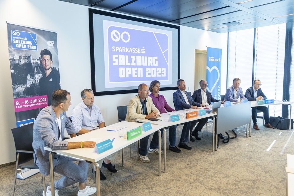 Von links nach rechts bei der Pressekonferenz: Philipp Schörghofer (RK&P Sportmanagement), Edi Radacher (RK&P Sportmanagement), Günter Schwarzl (Sparkasse Salzburg Open, Veranstalter), Gerald Mandl (Sparkasse Salzburg Open, Veranstalter), Markus Sattel (Salzburger Sparkasse, Vorstandsdirektor), Christoph Paulweber (Salzburger Sparkasse, Vorstandsvorsitzender), Martin Panosch (Wiener Städtische Versicherung in Salzburg, Landesdirektor), Bernhard Auinger (Bürgermeister-Stellvertreter Stadt Salzburg).
