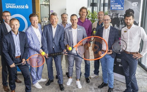 Von links nach rechts: Christoph Oppitz (s Versicherung Salzburg, Vertriebsdirektor), Bernhard Auinger (Bürgermeister-Stellvertreter Stadt Salzburg), Martin Panosch (Wiener Städtische Versicherung in Salzburg, Landesdirektor), Markus Sattel (Salzburger Sparkasse, Vorstandsdirektor), Edi Radacher (RK&P Sportmanagement), Philipp Schörghofer (RK&P Sportmanagement), Gerald Mandl (Sparkasse Salzburg Open, Veranstalter), Günter Schwarzl (Sparkasse Salzburg Open, Veranstalter), Christoph Paulweber (Salzburger Sparkasse, Vorstandsvorsitzender) und Jürgen Melzer (ÖTV-Sportdirektor und -Davis-Cup-Kapitän).