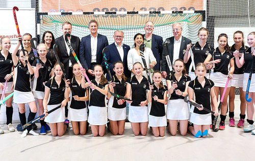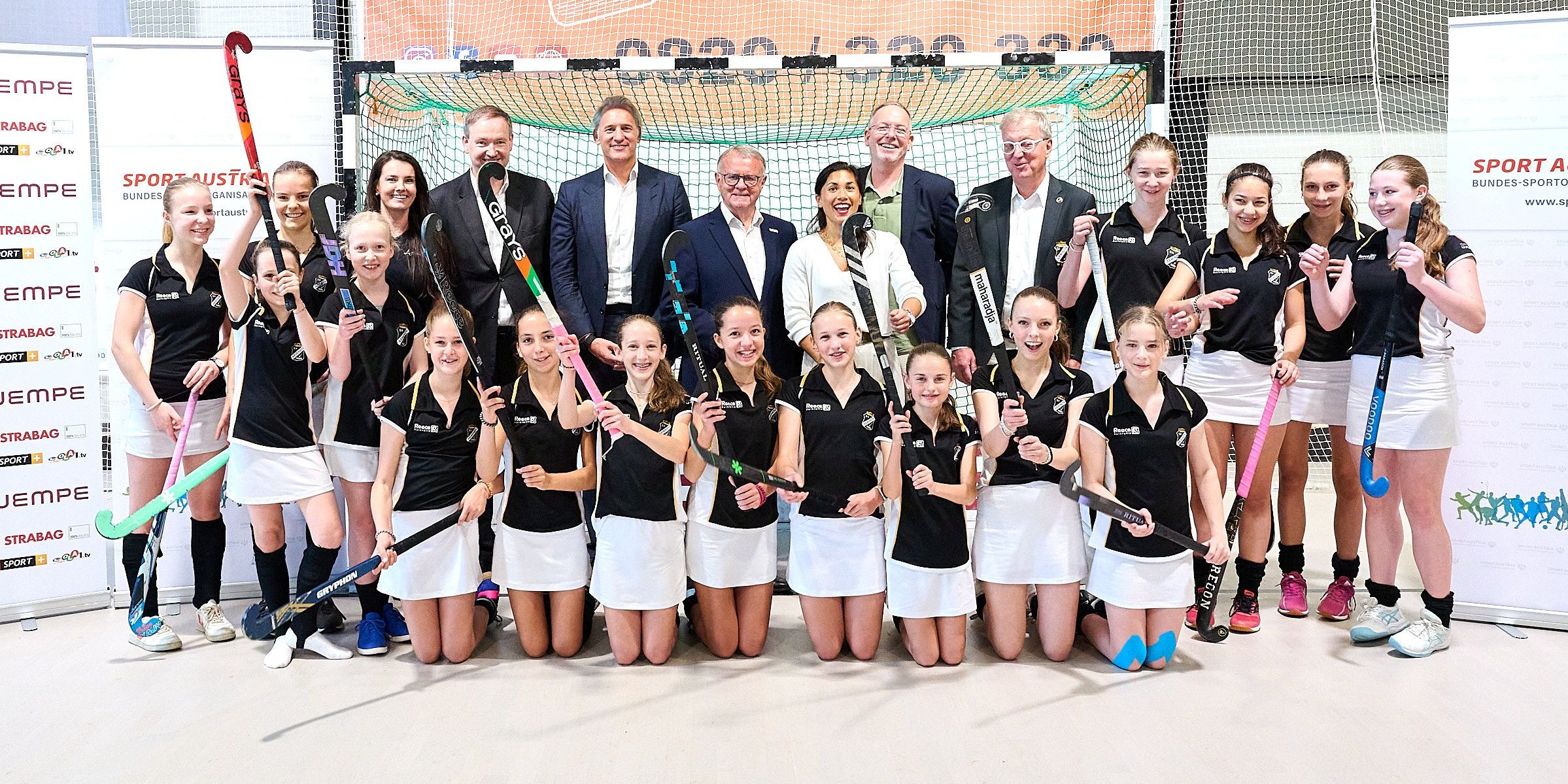 SV-Arminen-Nachwuchsspielerinnen mit stehend von links nach rechts: Trainerin Asia Sondhi, Univ.-Prof. Dr. Christian Helmenstein, ÖTV-Präsident Martin Ohneberg, Sport-Austria-Präsident Hans Niessl, Ex-Hockey-Nationalteamspielerin Kristine Vukovich, Sport-Austria-Vizepräsident Spitzensport Michael Eschlböck, SV-Arminen-Präsident Stephan Scharner.