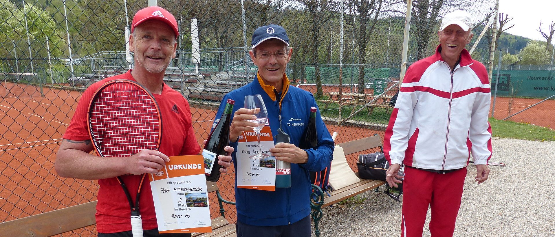 Trotz Wetterkapriolen konnte das dritte Turnier der Zischka ÖTV-Seniors-Trophy beim TC Neumarkt vom 27. April bis zum 2. Mai von Turnierleiter Johann Hansel nach einigen Planänderungen erfolgreich über die Bühne gebracht werden. Nach anfänglichen wetterbedingten Verschiebungen wurde nicht nur das Wetter besser, auch die Wettkämpfe wurden es. In Anbetracht der kurzfristigen Vergabe des Turniers nach Neumarkt konnte eine für Salzburger Verhältnisse Rekordteilnehmerzahl von 65 Nennungen registriert werden, darunter internationale Spitzenspieler wie Hannes Lienbacher vom Heimatverein oder Herbert Riederer. Die Highlights waren die Spiele im Herrenbewerb 35+ mit Sieger Peter Geppel (1. Klosterneuburger TV), dem zweitplatzierten Roland Riepl (SPG Luftenberg) sowie Christian Prindl und Jürgen Vollmaier, die in der jüngeren Altersgruppe die Herausforderung suchten.